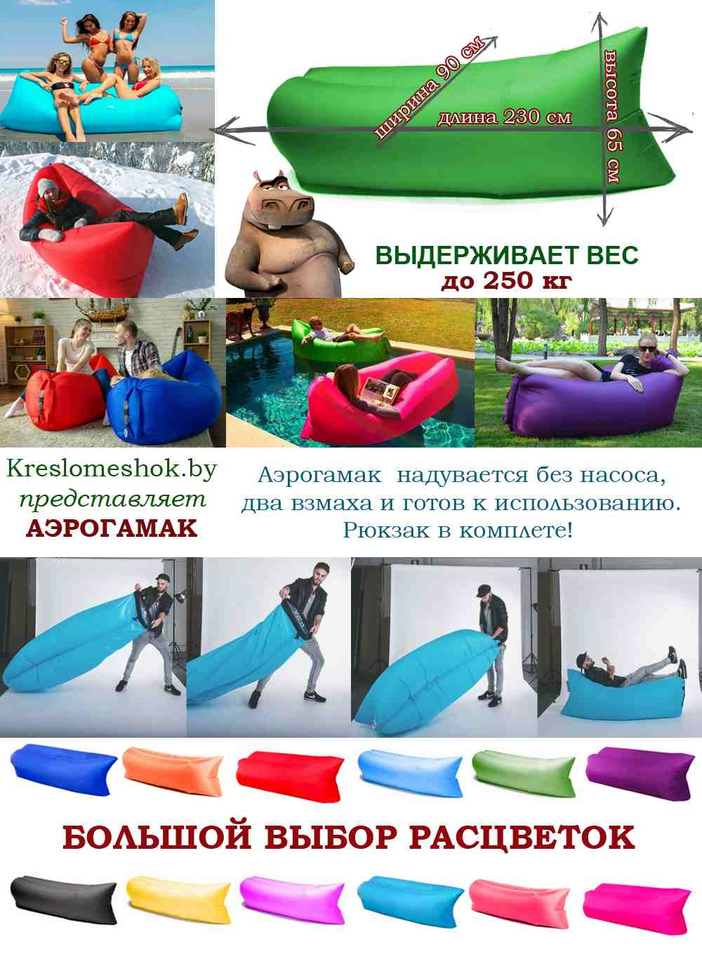 Наш надувной аэрогамак можно взять с собой в парк, на пикник или в поход, на пляж, на рыбалку или охоту, на горонолыжный склон, на фестиваль под открытым небом или на дачу.